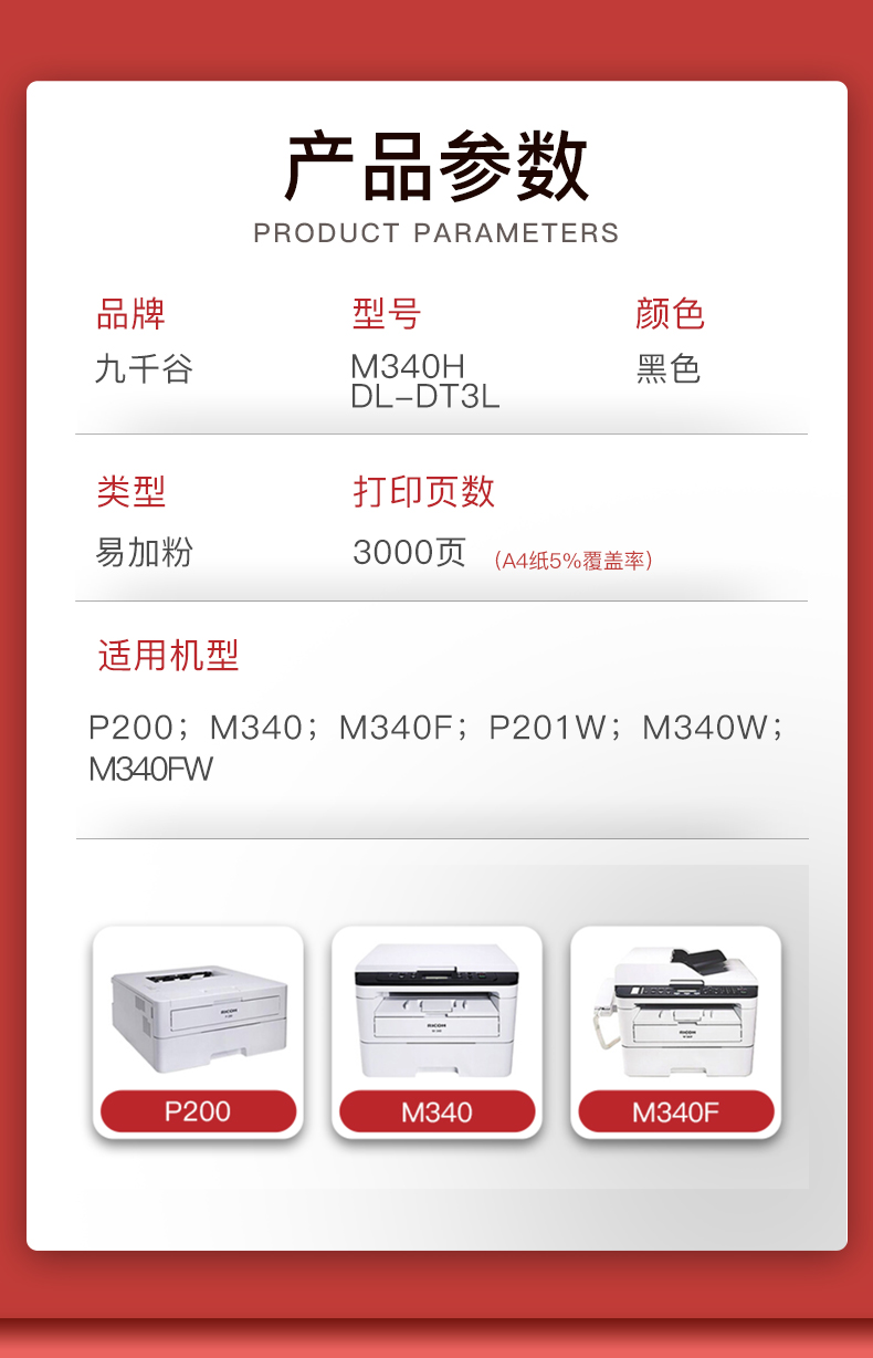 适用机型:理光Ricoh p200/p201w M340FW M340F/P M340W/M粉盒 碳粉盒 墨粉